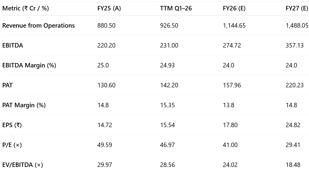 EV/EBITDA expected to fall from 28.56× (TTM) to 18.48× (FY27E) as earnings compound faster than EV — leaving scope for re-rating if execution beats expectations.