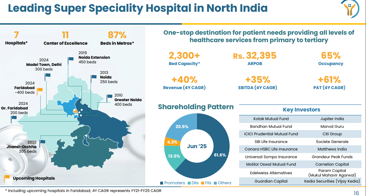 1,605 beds as of FY25 end, excluding upcoming hospitals in Delhi & Faridabad to scale 2X up to ~3,000 by FY28